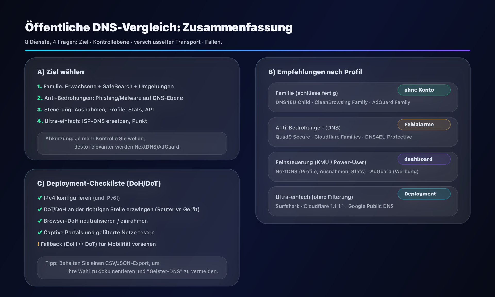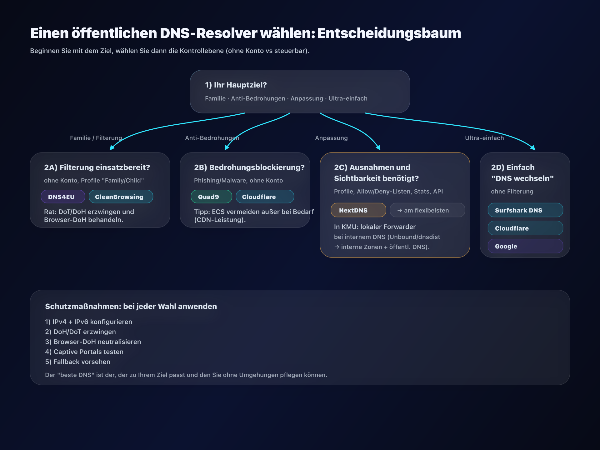 Es gibt keins. Die richtige Wahl hängt von Ihrem Ziel ab: Familienfilter, Anti-Bedrohungen, Verwaltung oder einfach ISP-DNS ersetzen. Beginnen Sie mit dem Anwendungsfall, wählen Sie dann einen Resolver, der mit einer akzeptablen Logging-Richtlinie konsistent ist.