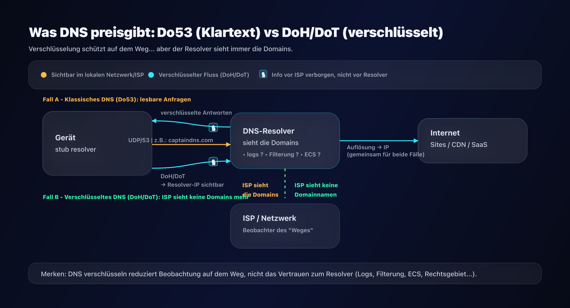 - Do53 ("klassisches" DNS): leicht auf der letzten Meile abzufangen/zu ändern (öffentliches WLAN, ISP, Unternehmensnetzwerk...).