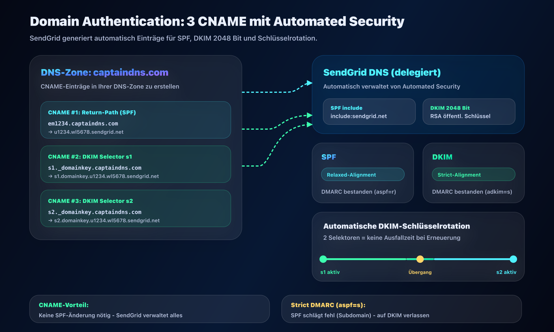 Die beiden Selektoren ermöglichen die automatische DKIM-Schlüsselrotation ohne Dienstunterbrechung. Wenn SendGrid aus Sicherheitsgründen Schlüssel erneuern möchte, kann es einen neuen Schlüssel auf s2 generieren, während s1 noch aktiv ist, und dann schrittweise den Verkehr umschalten. Dies vermeidet jede Unterbrechung der Zustellbarkeit während des Schlüsselwechsels.