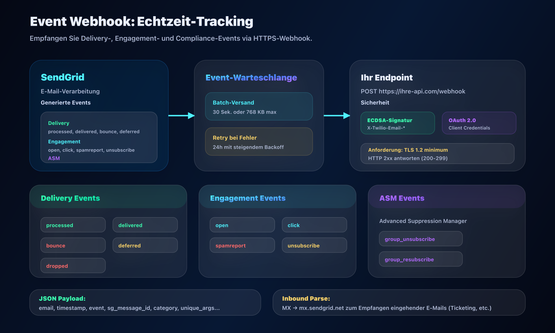 Event Webhook: HTTP-Endpoint, der von SendGrid bei Events aufgerufen wird (delivered, bounced, opened, clicked). Versand in Batches (30s oder 768 KB). Retry bei Fehlschlag für 24h. Sicherheit: ECDSA-Signatur oder OAuth 2.0.