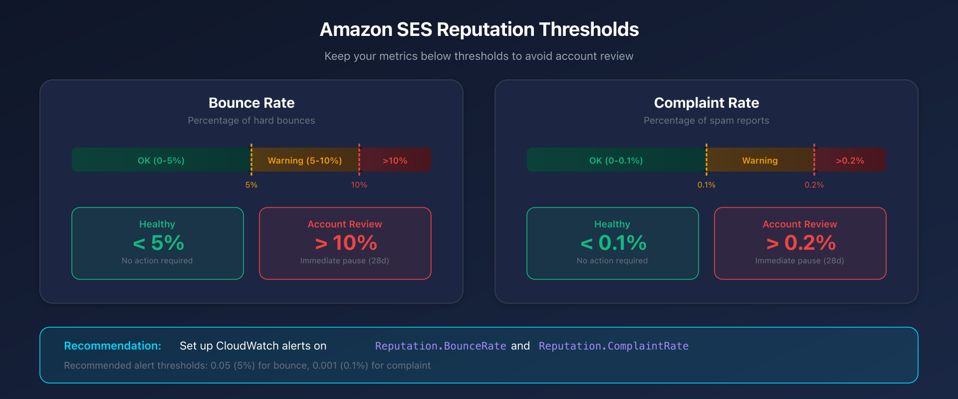 Reputation.BounceRateandReputation.ComplaintRate - Soft bounces: SES automatically retries for 12h