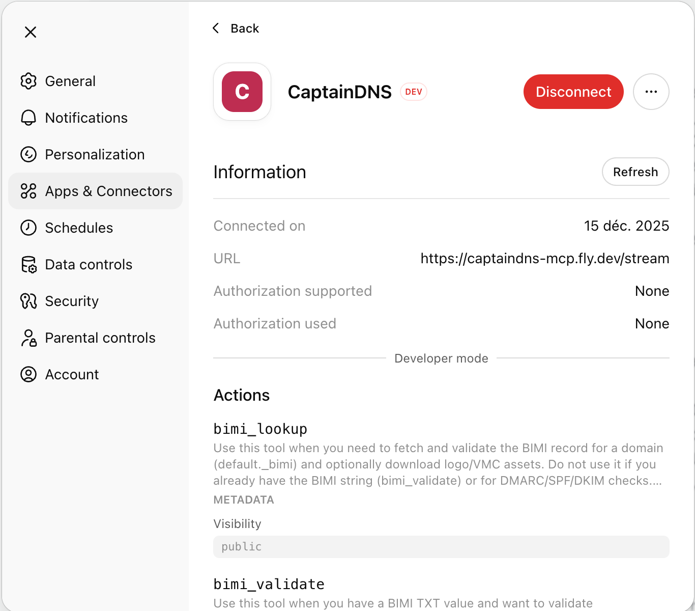 - Connect the CaptainDNS MCP server in ChatGPT, then enable the connector in a conversation.