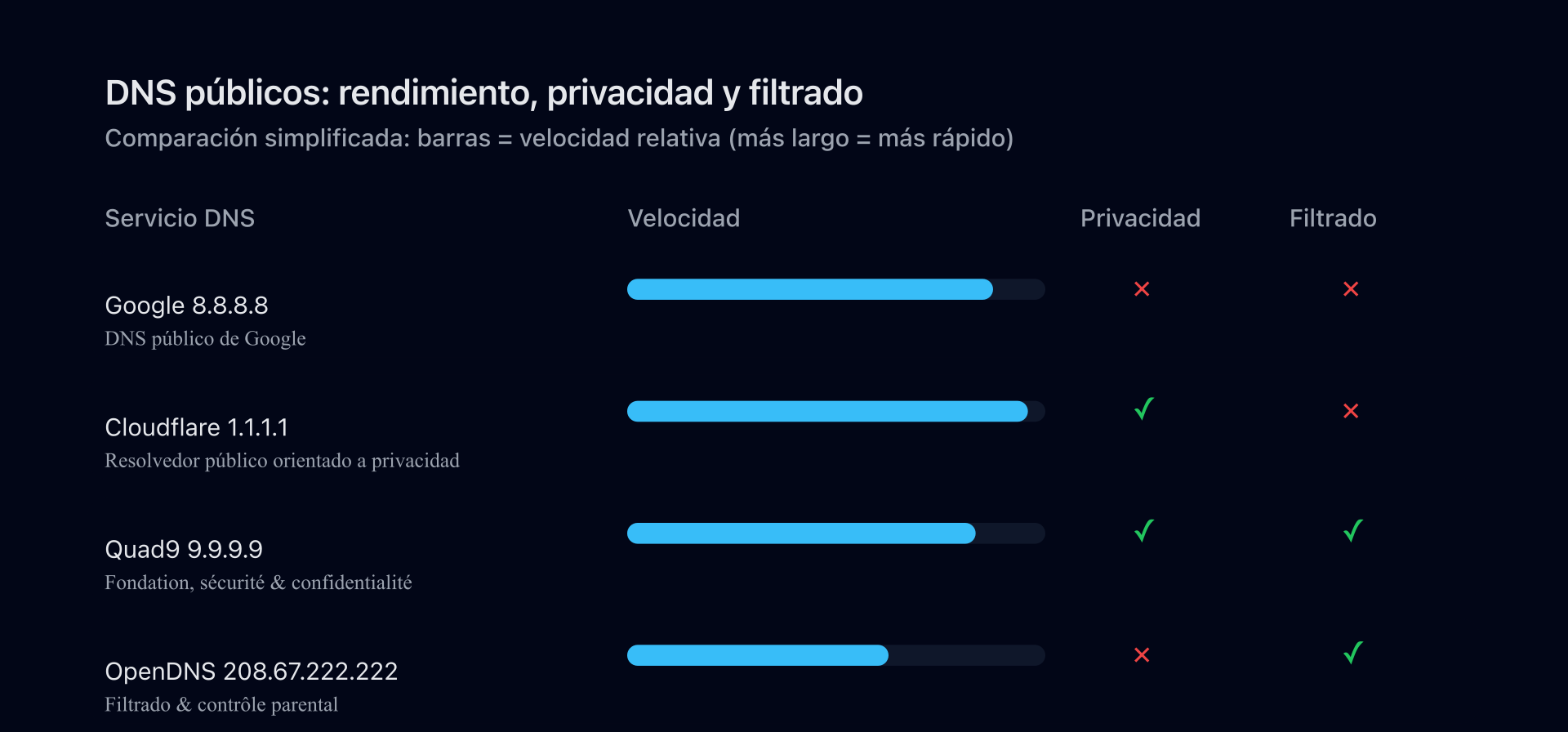 Para elegir un resolvedor público conviene comparar algunos actores clave en tres ejes: velocidad, privacidad y filtrado.