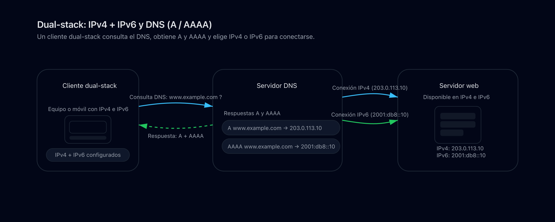 - En la práctica, lo adecuado no es elegir entre IPv6 vs IPv4 sino hacer coexistir ambos (dual-stack), publicar registros A (IPv4) y AAAA (IPv6) en el DNS y preparar poco a poco la infraestructura para un futuro mayoritariamente IPv6.
