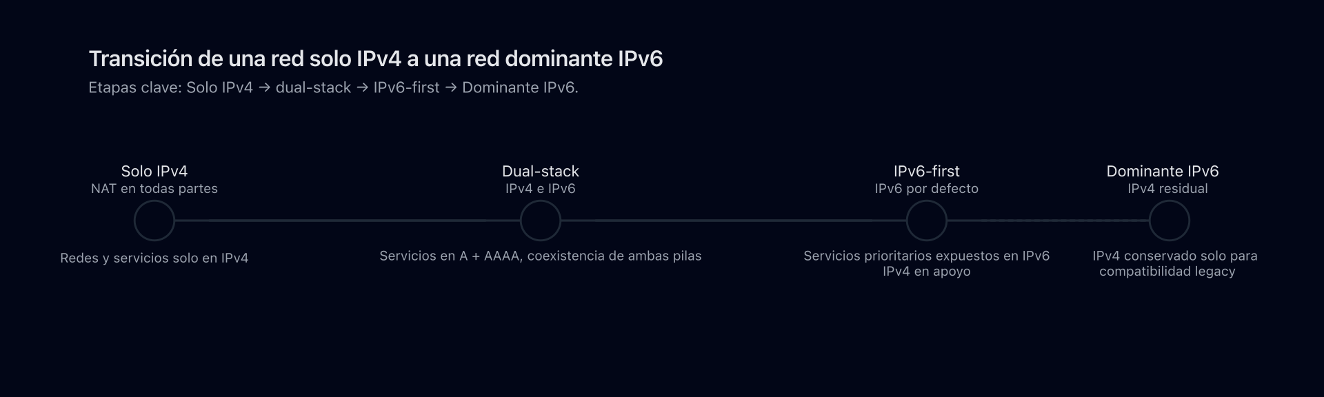 - muchas VPN, filtros y herramientas empresariales se diseñaron exclusivamente para IPv4. La estrategia realista no es cortar IPv4, sino adoptar IPv6 en paralelo (dual-stack) y reducir progresivamente la dependencia de IPv4 con el tiempo.