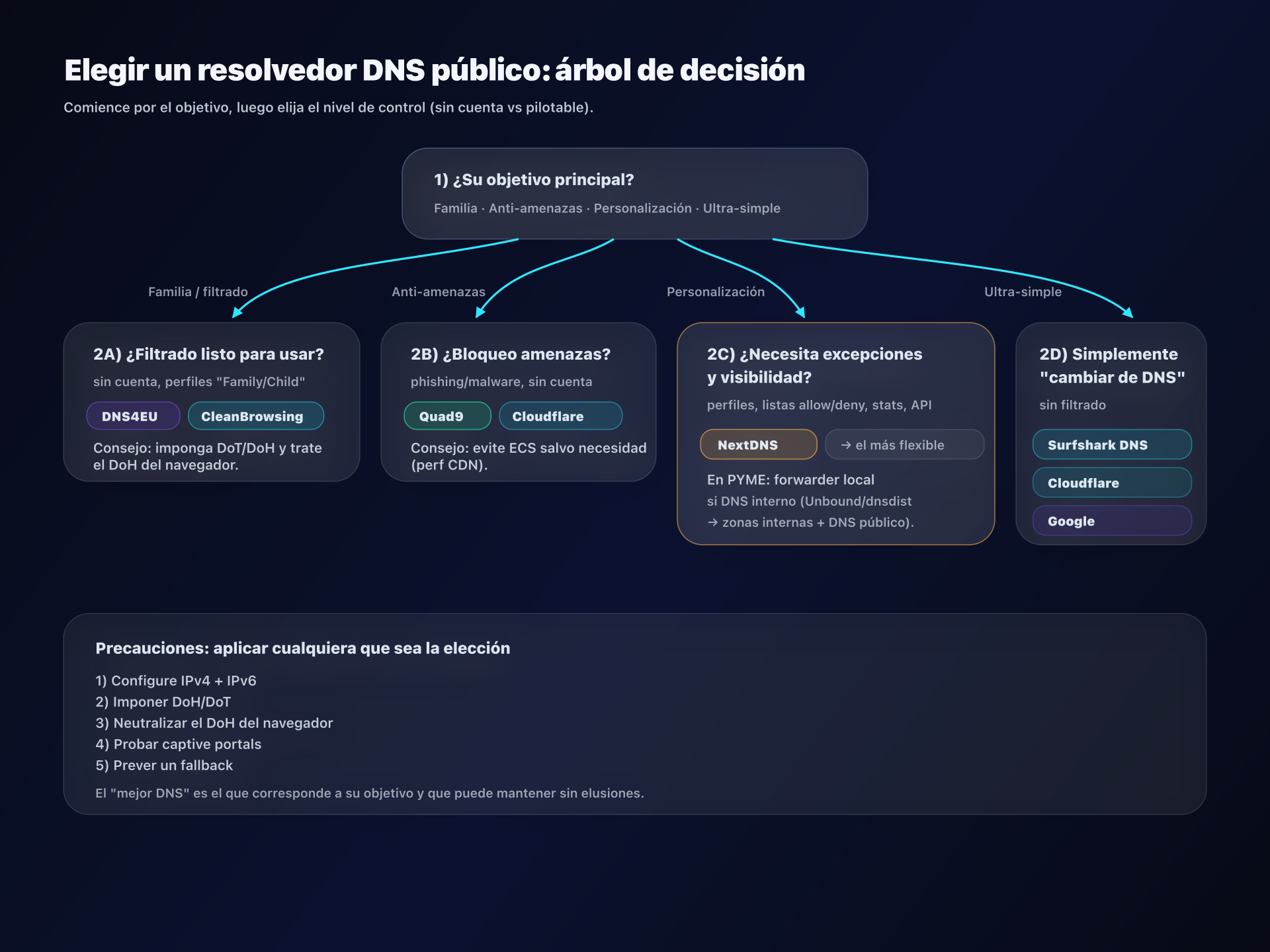 - 📢 Ocho DNS públicos, ocho filosofías: elige primero tu objetivo (privacidad, seguridad, familia, gestión) y luego implementa DoH/DoT correctamente.