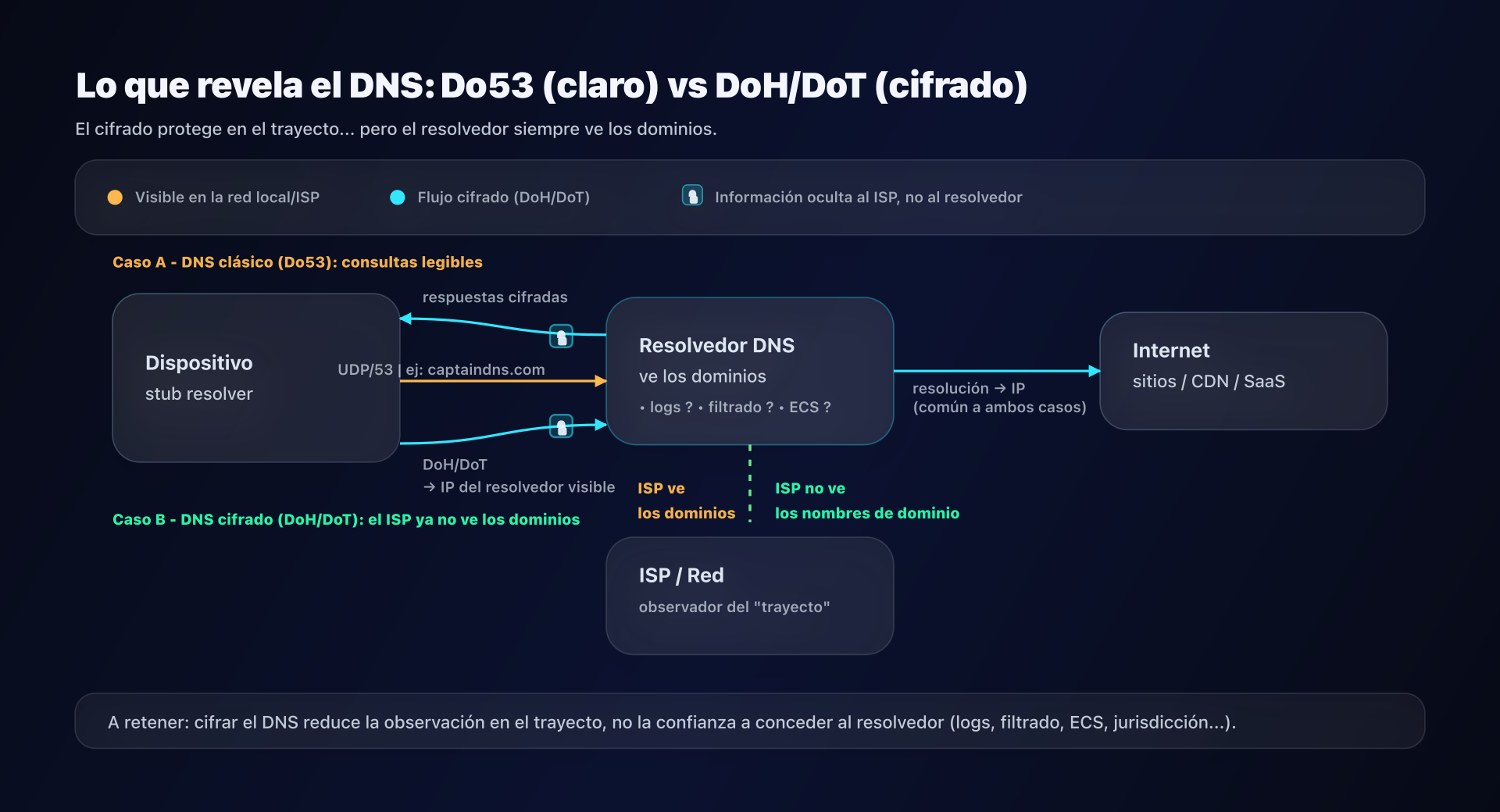 - Do53 (DNS "clásico"): fácil de interceptar/modificar en el último kilómetro (Wi-Fi público, ISP, red corporativa...).