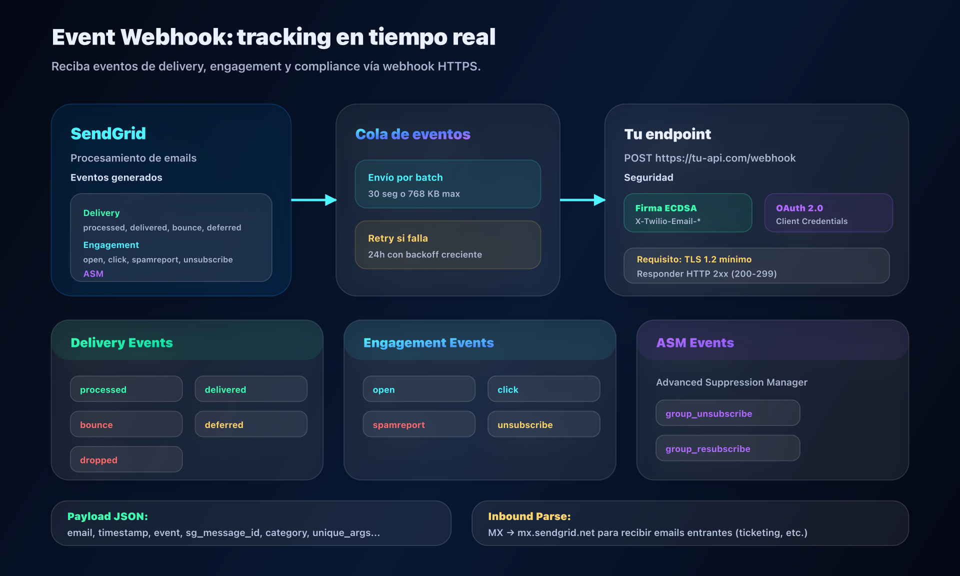 Event Webhook: Endpoint HTTP llamado por SendGrid durante eventos (delivered, bounced, opened, clicked). Envío por lotes (30s o 768 KB). Retry durante 24h en caso de fallo. Seguridad: firma ECDSA u OAuth 2.0.