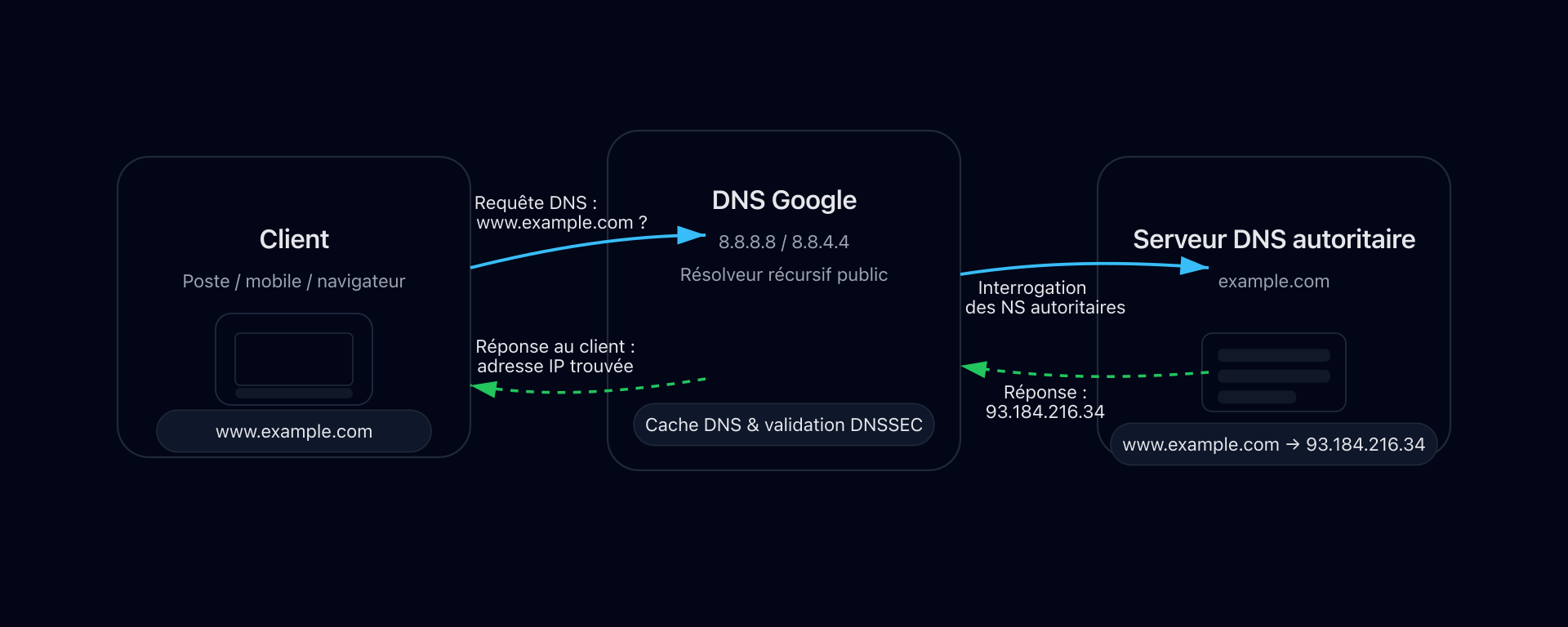 L'adresse 8.8.8.8 est le serveur DNS récursif public mis à disposition par Google depuis 2009. Concrètement, il s'agit d'un résolveur DNS (ou DNS resolver) ouvert à tous les internautes, qui peut être utilisé en lieu et place du serveur DNS fourni par votre fournisseur d'accès (FAI). Entrer 8.8.8.8 dans la configuration réseau de votre appareil signifie que vos requêtes DNS (traduction de noms de domaine en adresses IP) seront traitées par les serveurs Google, plutôt que par le DNS par défaut de votre FAI.