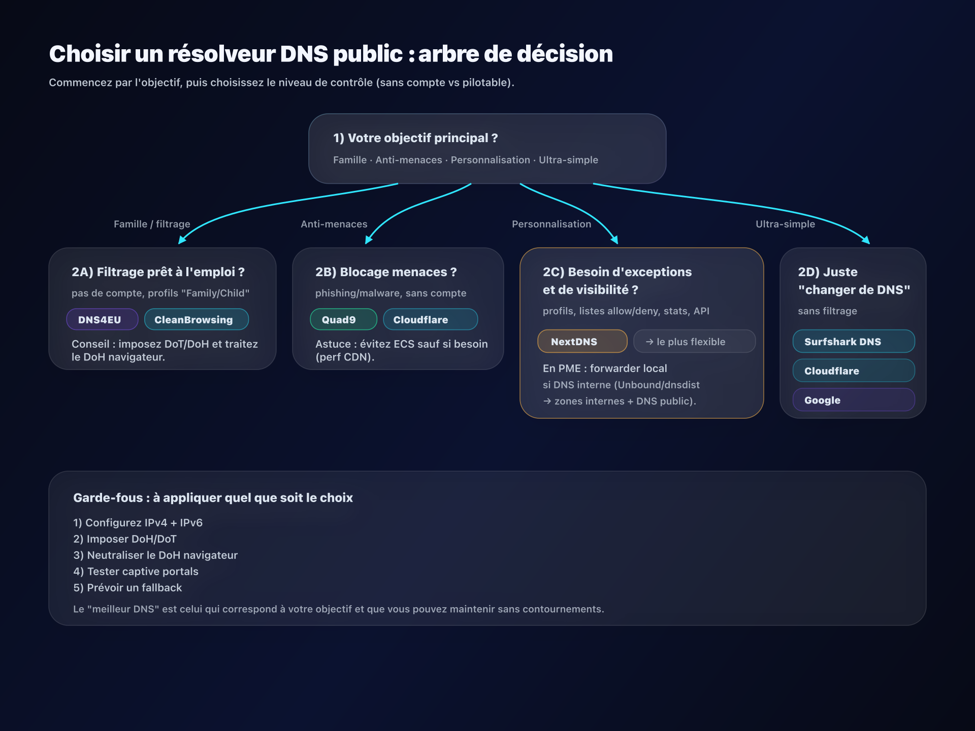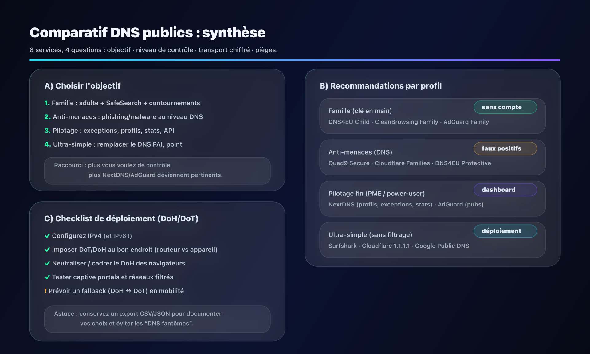 - 📢 Huit DNS publics, huit philosophies : choisissez d'abord votre objectif (vie privée, sécurité, famille, pilotage) puis imposez DoH/DoT proprement.