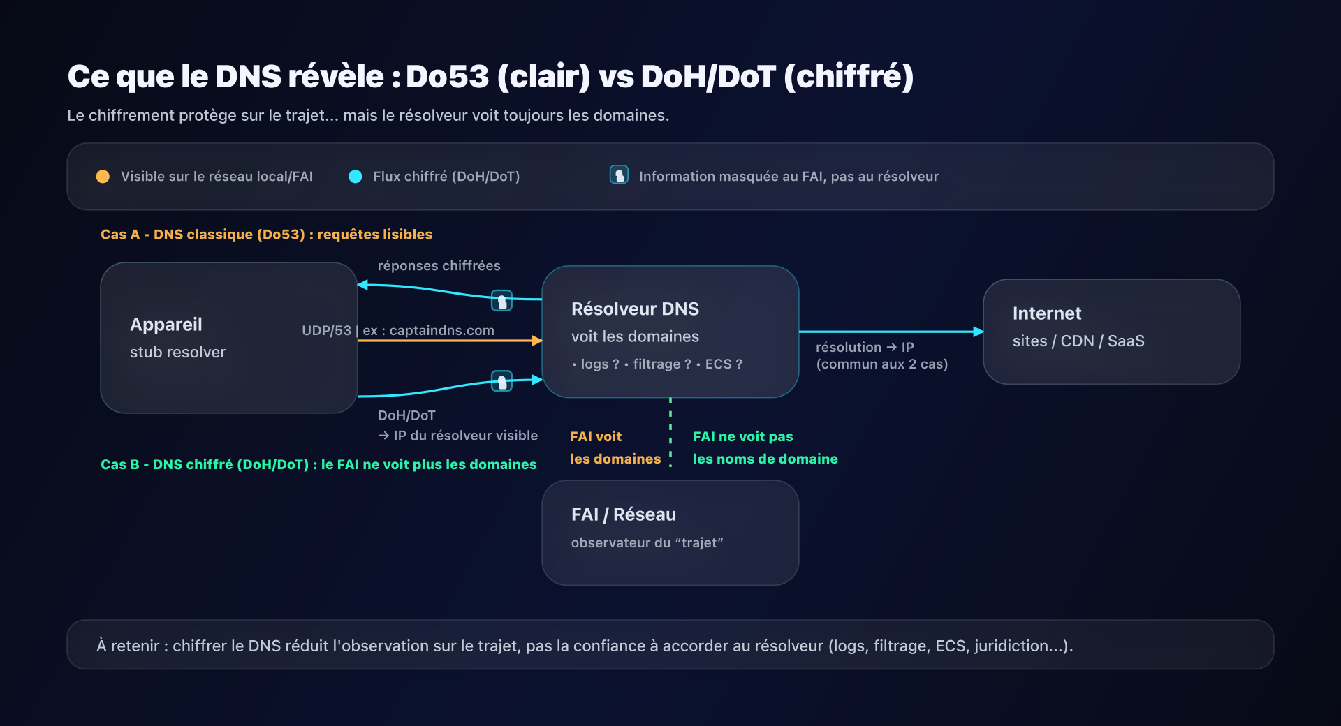 - DoT / DoH : empêche l'espionnage entre vous et le résolveur. Le résolveur, lui, continue de voir vos requêtes.