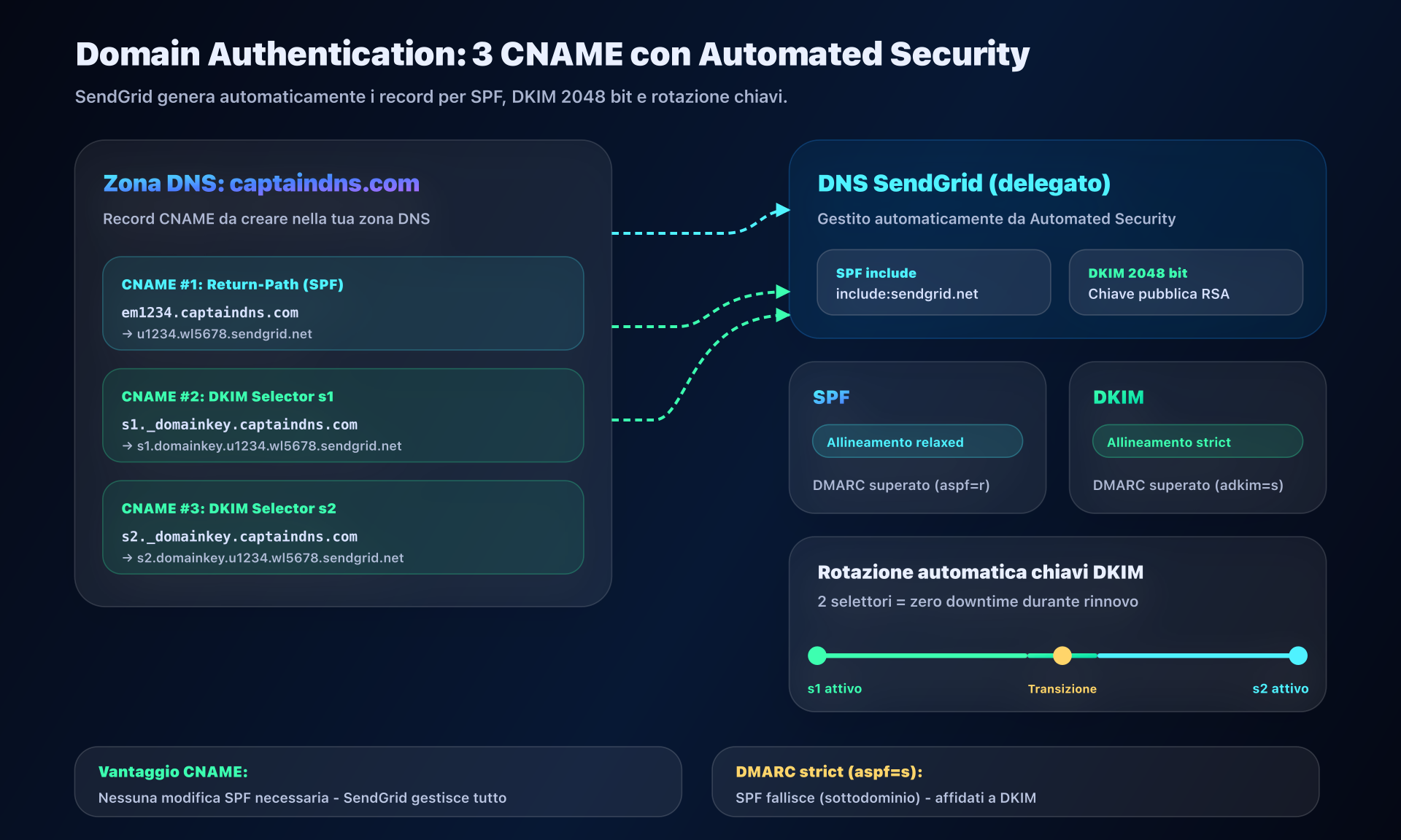 I due selettori permettono la rotazione automatica delle chiavi DKIM senza interruzione del servizio. Quando SendGrid vuole rinnovare le chiavi per ragioni di sicurezza, può generare una nuova chiave su s2 mentre s1 è ancora attivo, poi spostare progressivamente il traffico. Ciò evita qualsiasi interruzione di deliverability durante il cambio chiave.