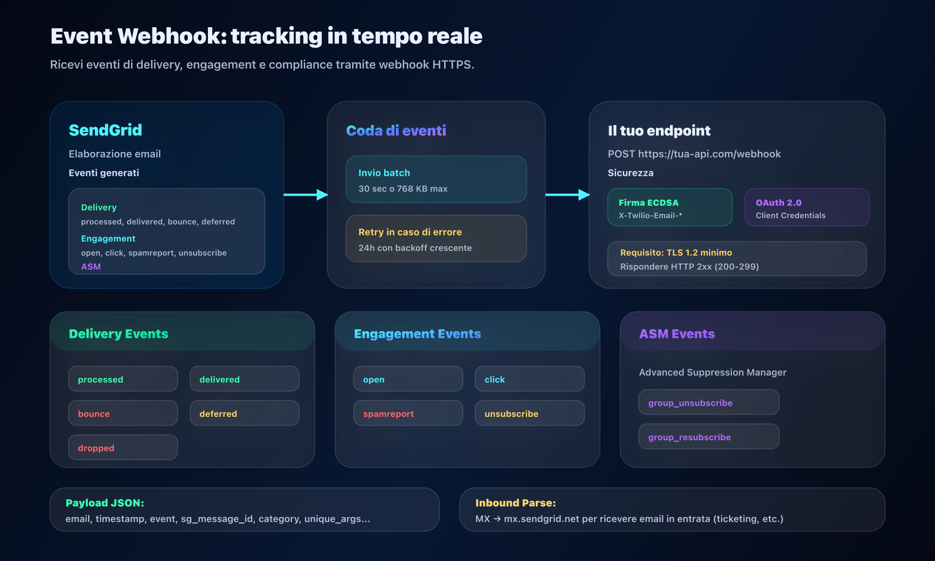 Event Webhook: Endpoint HTTP chiamato da SendGrid durante eventi (delivered, bounced, opened, clicked). Invio per batch (30s o 768 KB). Retry per 24h in caso di fallimento. Sicurezza: firma ECDSA o OAuth 2.0.