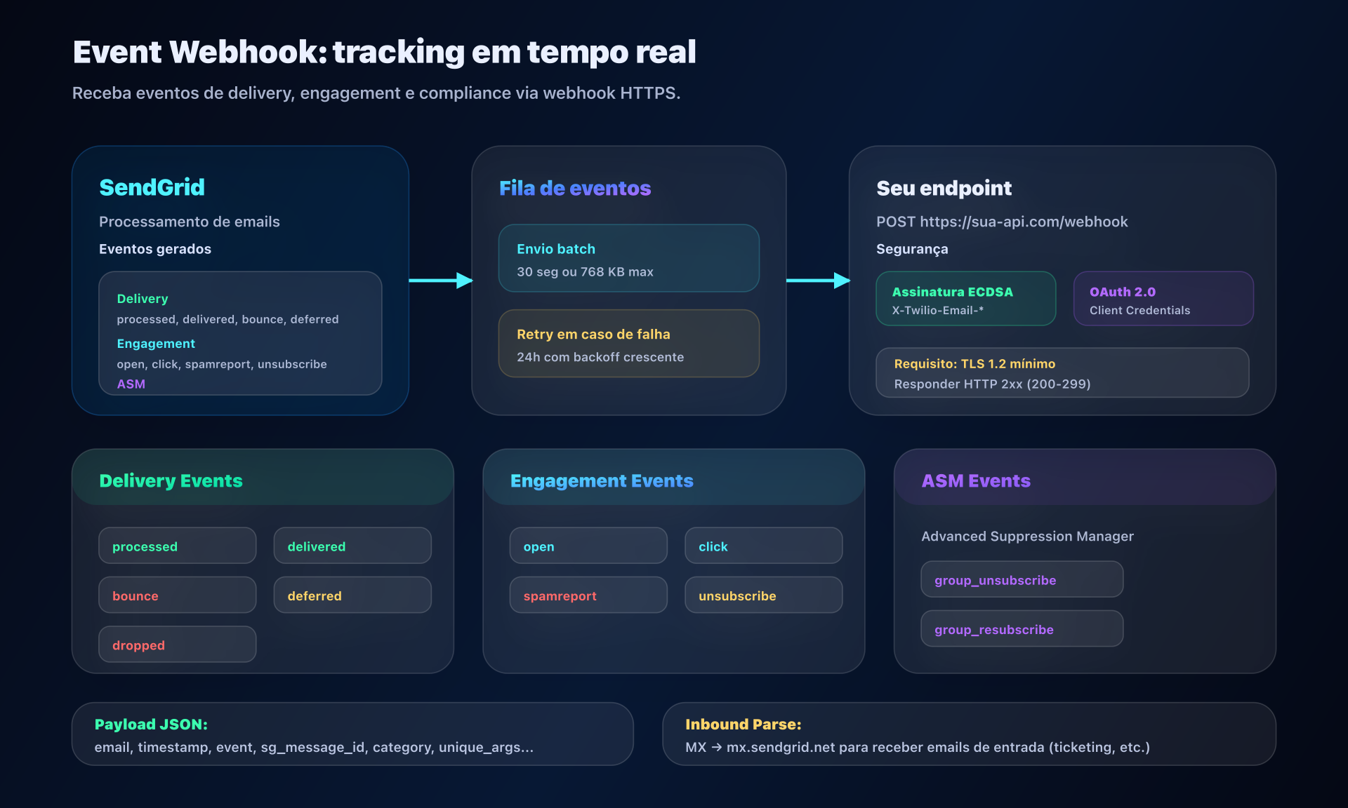 Event Webhook: Endpoint HTTP chamado pela SendGrid durante eventos (delivered, bounced, opened, clicked). Envio por lote (30s ou 768 KB). Retry durante 24h em caso de falha. Segurança: assinatura ECDSA ou OAuth 2.0.